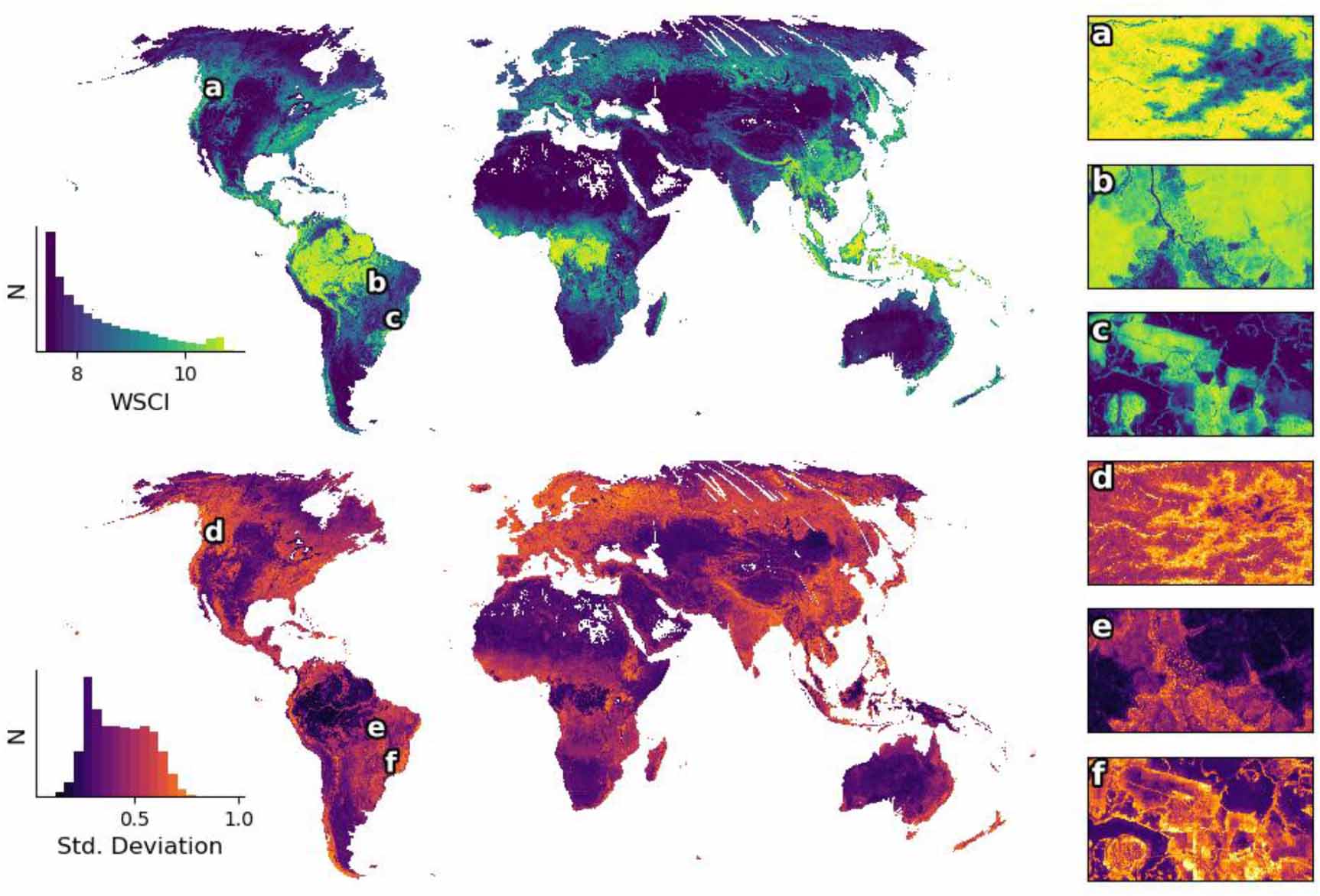 The figure presents the Global map of waveform structural complexity index (WSCI) and associated uncertainty produced by the GEDI-SAR fusion model for April–June 2019–2022. The top panel shows predicted WSCI values while the bottom panel displays the predicted standard deviation. These global inference maps extend beyond GEDI’s orbital coverage and include the Earth’s entire landmass. High-resolution insets highlight: (a), (d) structural complexity along a topographical gradient in Olympic National Park, USA; (b), (e) fire disturbed forest in the Xingu Indigenous Territory in the southern Amazon; and (c), (f) a mosaic of planted and natural forest patches in Brazil’s Atlantic rainforest. Note how transitional areas show elevated predicted uncertainty. White stripes in Northern Russia are sections where either PALSAR or Sentinel-1 data were entirely missing when generating the image mosaic.